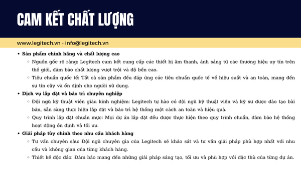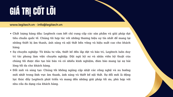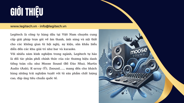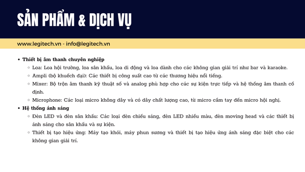 Legitech là công ty hàng đầu tại Việt Nam chuyên cung cấp giải pháp trọn gói về âm thanh, ánh sáng và nội thất cho các không gian từ hội nghị, sự kiện, sân khấu biểu diễn đến các khu giải trí như bar và karaoke.
