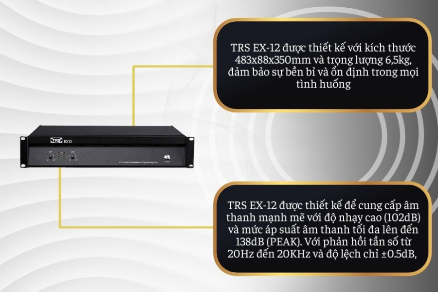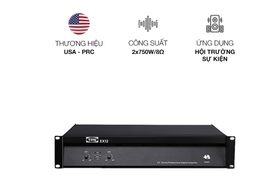 TRS EX-12 được thiết kế theo tiêu chuẩn cục đẩy biểu diễn hiện đại, phù hợp cho các hệ thống âm thanh từ hội trường, sân khấu, phòng họp đến sự kiện lưu động. Sản phẩm nổi bật nhờ khả năng khuếch đại mạnh mẽ, độ nhiễu thấp và vận hành ổn định trong thời gian dài. Giao diện thân thiện, dễ sử dụng, cùng việc hỗ trợ nhiều chế độ bảo vệ thông minh giúp EX-12 thích hợp cho cả kỹ thuật viên chuyên nghiệp lẫn người dùng phổ thông.