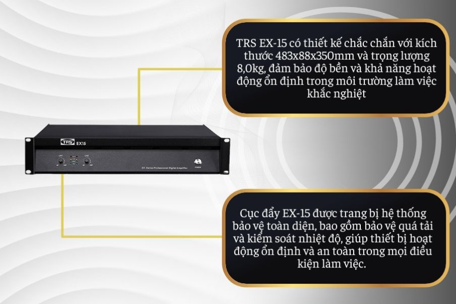 Cục đẩy công suất TRS EX-15 được tinh chỉnh nhằm giảm thiểu méo tiếng, đảm bảo tín hiệu âm thanh đầu ra luôn sạch, tự nhiên và đầy đủ chi tiết. Điều này đặc biệt quan trọng trong các sự kiện cần độ rõ lời cao.